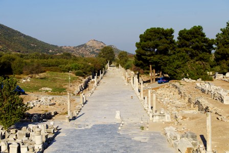 ケルスス図書館の横にマゼウスとミトリダテスの門があり、その先に商業アゴラが広がっています。さらにマーブル通りを進むと右側に巨大な野外劇場が見えてきます。これはローマ人によりAD1〜2世紀ごろ作られたもので収容人数は24,000人だったそうです。野外劇場を左側に回るとマーブル通りがまっすぐ伸び当時は港につながっていたそうです。