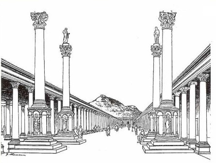 市公会堂の先左側にローマ皇帝ドミトリアヌスを祭る神殿、その反対側にはローマの独裁官メミウスがエフェスを奪還の記念碑があります。
